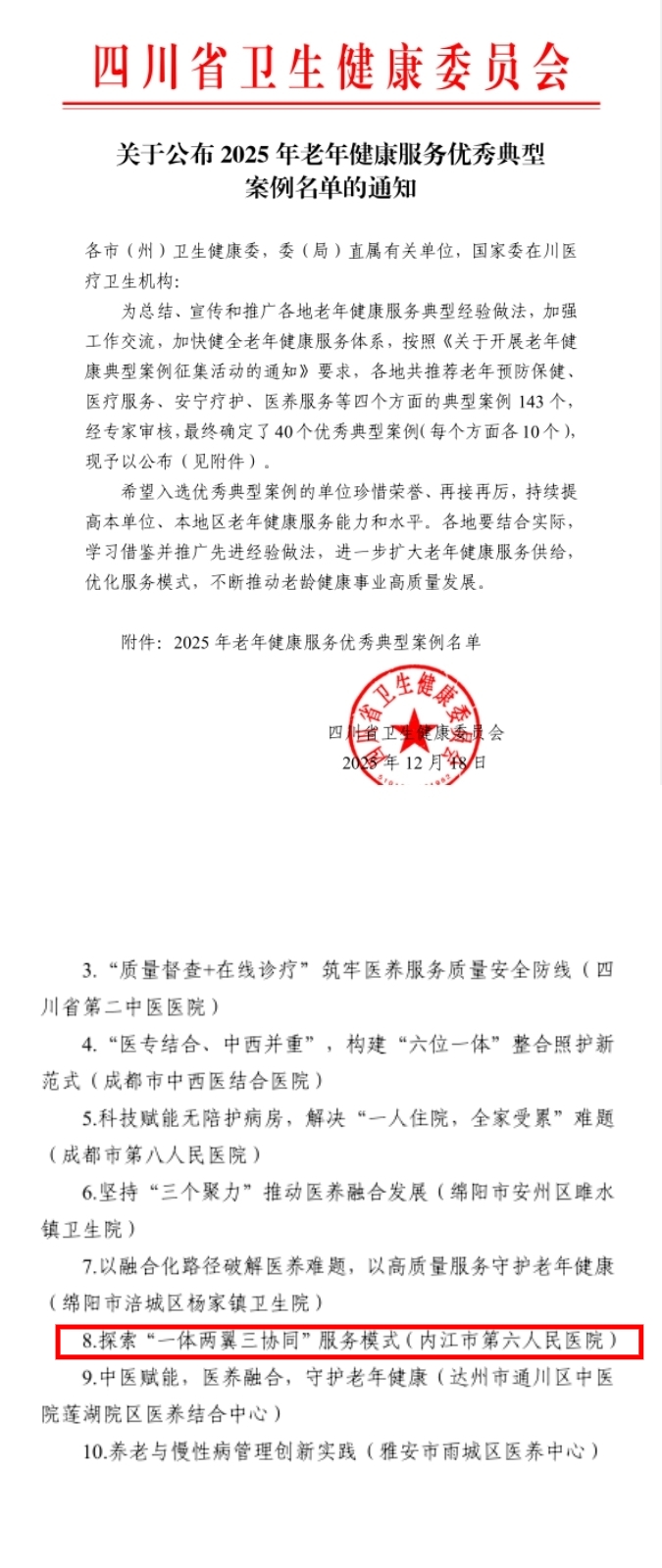 “此次入选,既是对医院多年深耕医养结合领域的肯定,更是鞭策。”我院相关负责人表示,医院将持续深化模式创新,不断提升服务能力与品质,为推动区域老龄健康事业高质量发展贡献更多可复制、可推广的“内江经验”。